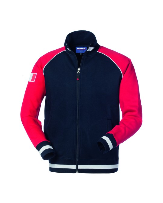 С централно затваряне с цип, вътрешна лента за пот в яката, контрастни реглан ръкави с бели кантове. Еластични плетени маншети, яка и колан, два долни джоба с кант.